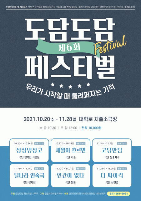 이어지는 작품은 극단 몽중자각의 여섯 명의 고등학생이 펼치는 교육, 정치, 사랑부터 결혼까지 두루 섭렵한 대화를 담은 ‘고딩만담’이다. 이어 극단 청사진의 ‘달나라 연속극’, 극단 필통의 연극 ‘인간이 없다’, 극단 신인류의 ‘더 싸이킥’까지 총 6편의 공연이 이어져 계속된 볼거리를 선사한다.