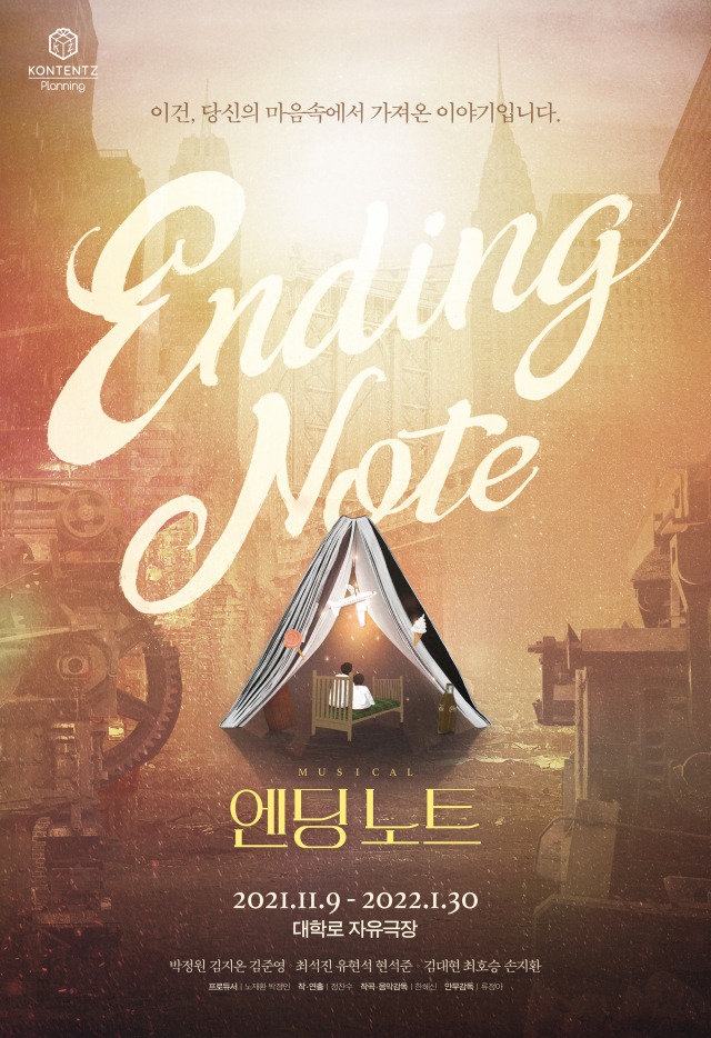 뮤지컬 '엔딩 노트'는 2021년 11월 9일 대학로 자유극장에서 개막해 2022년 1월 30일까지 공연된다.
